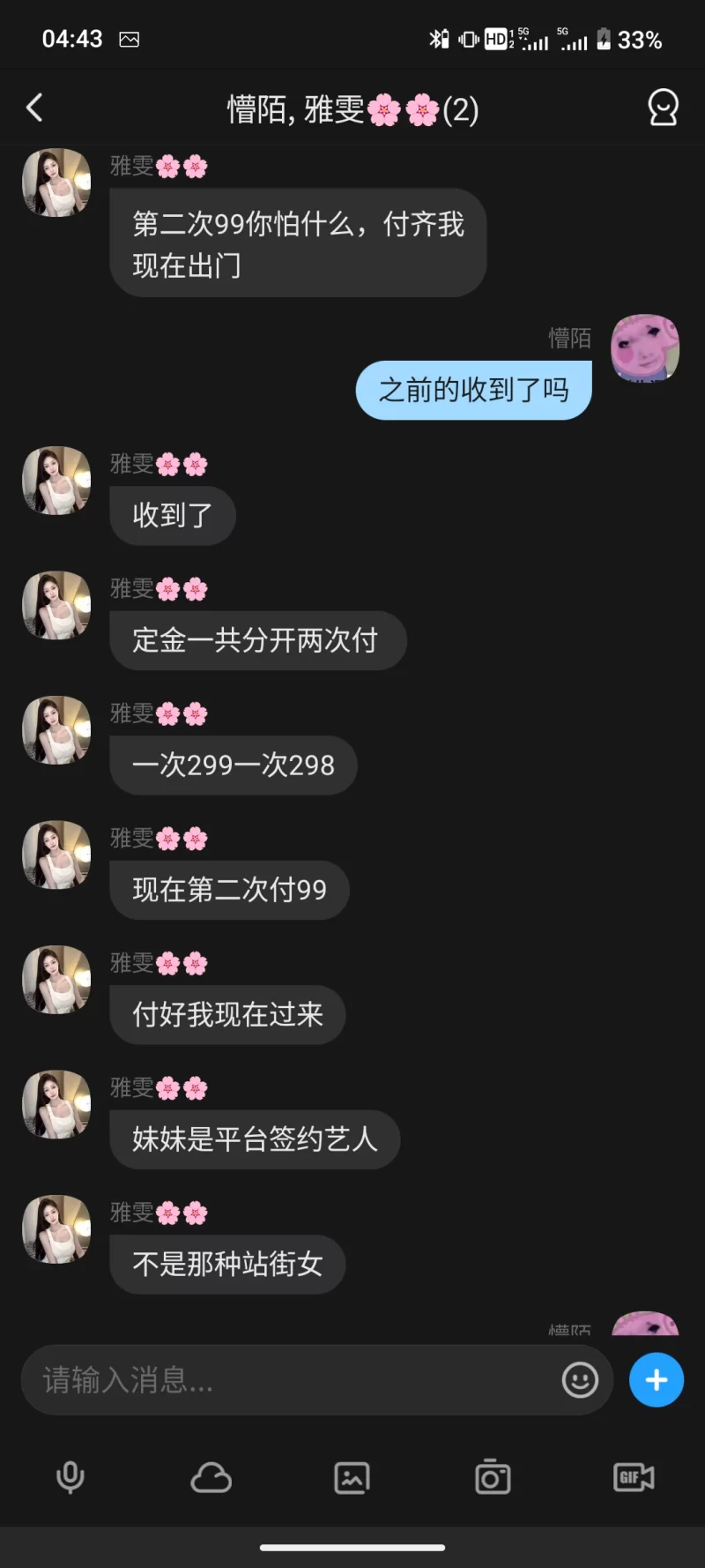 威客管理提示:要求付定金 保证金的,总之提前要钱的都是骗子 就在小古林附近的七天酒店,有事出差,看到门下的名片,打电话询问,怕是仙人跳,结果约定好价格,来了之后敲门一直在用手机,要分开洗澡,聊天说明不开始不收费,几次试过名片,被人告知这种情况很危险,突然决定不要了,半夜就被敲门,开门几个男的说人来了必须给钱,给了100就轰走了,这种容易被仙人跳,小心!而且长相不好